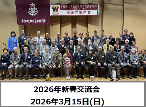 2026年4月11日 / 最終更新日時 : 2026年4月11日 kt-kanri 新春交流会 新春交流会(報告) 令和8年小金井稲門会新春交流会についての報告 今年度は3月15日(日)に小金井宮地楽器ホール小ホールにて開催されました。 辻本会長挨拶ののち、新入会員紹介と長寿祝いセレモニーが行われました。 長寿祝いは、喜 […]
