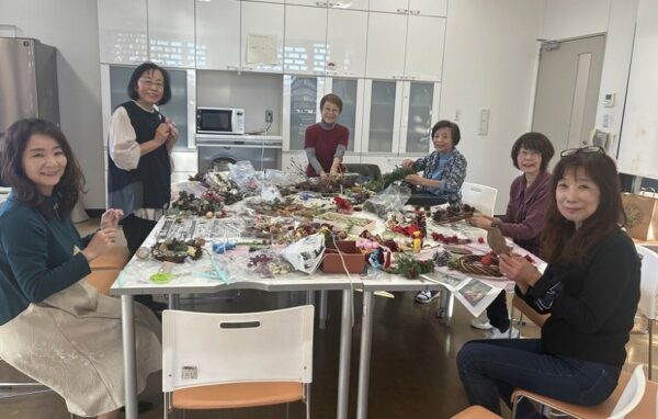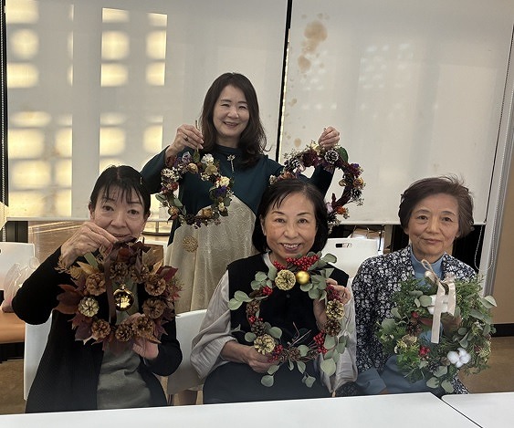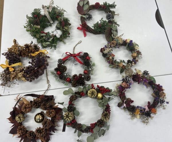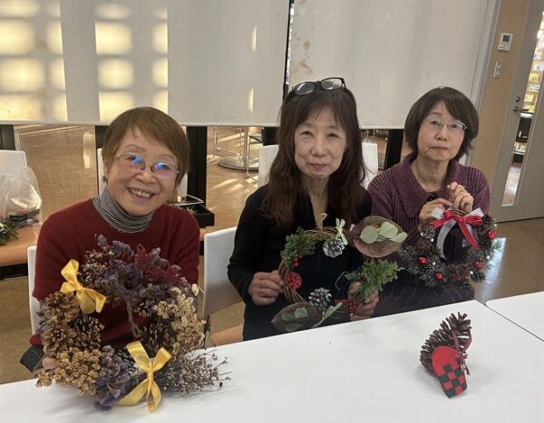 クリスマスリースは市販品では数千円はしますが、百均のリース台、2~3のパーツ代の出費と持ち寄りで(松ぼっくり、花、リボン等)、会費300円で作れたことは、初心者としては目から鱗です。